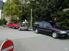 Heute ist Packtag. Die Twin steht schon fertig in der Garage, natürlich fahre ich wieder mit meinem guten alten Motorrad. Die Africa Twin (eine RD07 Bj. 94) hat mittlerweile über 80.000 km auf dem Buckel und hat letzte Woche ein neues Technoflex Fahrwerk verpaßt bekommen. Damit ist das Fahren ein Traum, der Unterschied ist kaum zu glauben. Erstens ist sie durch den Umbau deutlich höher geworden und zweitens ist das Ansprechverhalten sehr viel sensibler und feiner geworden. Man hat den Eindruck, als wenn man "Mercedes fährt". Dieser Eindruck sollte sich später im Gelände noch vertiefen. Außerdem hatte ich noch die Lenkererhöhung von Touratech montiert, die niedrige Windschutzscheibe wieder montiert, Haupt- und Seitenständer etwas verlängert, die anfällige Honda Benzinpumpe gegen ein unterdruckbetriebenes Pendant aus einer Yamaha XJ600 ersetzt und so einige andere Modifikationen vorgenommen. Die Klamotten waren dank Packliste schnell zusammengesucht. Schnell noch den Motorradanhänger von Klaus-Dieter organisiert und dann die Twin aufgeladen. Am Nachmittag treffe ich Carsten, der dieses Jahr das erste Mal mitfahren möchte. Er hatte noch zwei LPD Funkgeräte organisiert, die wir dann von Auto zu Auto auf der Fahrt benutzen wollen. Sie sollten sich bewähren. Sie funktionieren allerdings nur, wenn man dicht beieinander fährt, ansonsten hat man nicht genügend Reichweite.